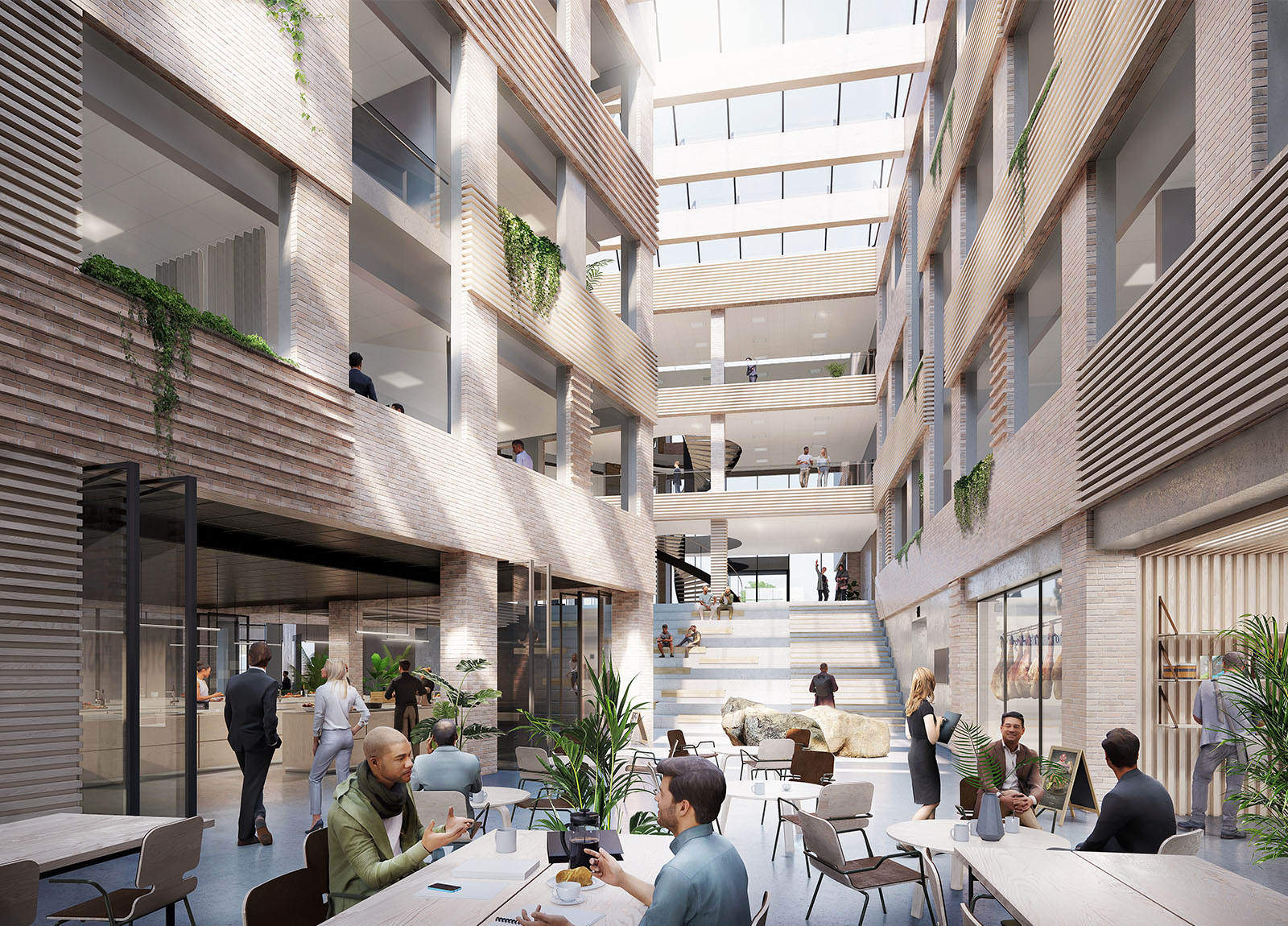 The main square serves as the heart of the building and acts as a gathering point with communal facilities such as a canteen, display kitchen, and an employee store. This central core is interconnected across the wings through open bridges and staircases, creating a figure-eight movement and connecting work areas across the four floors.