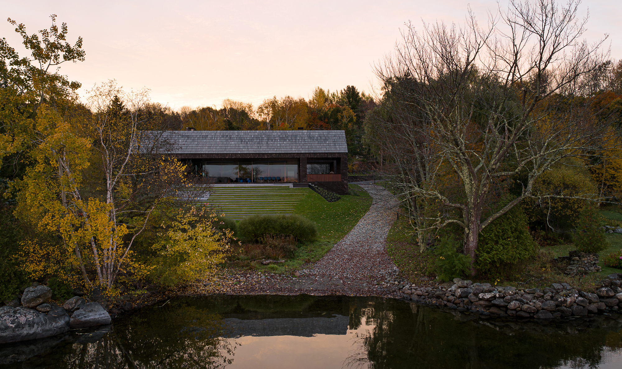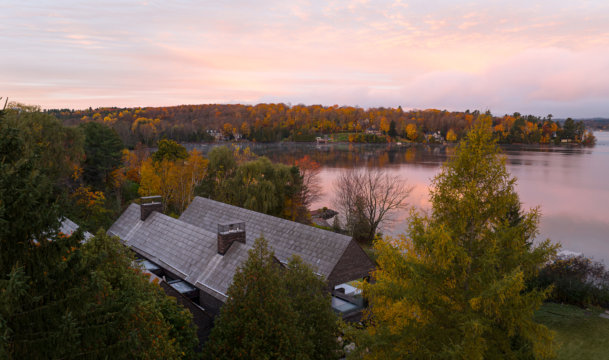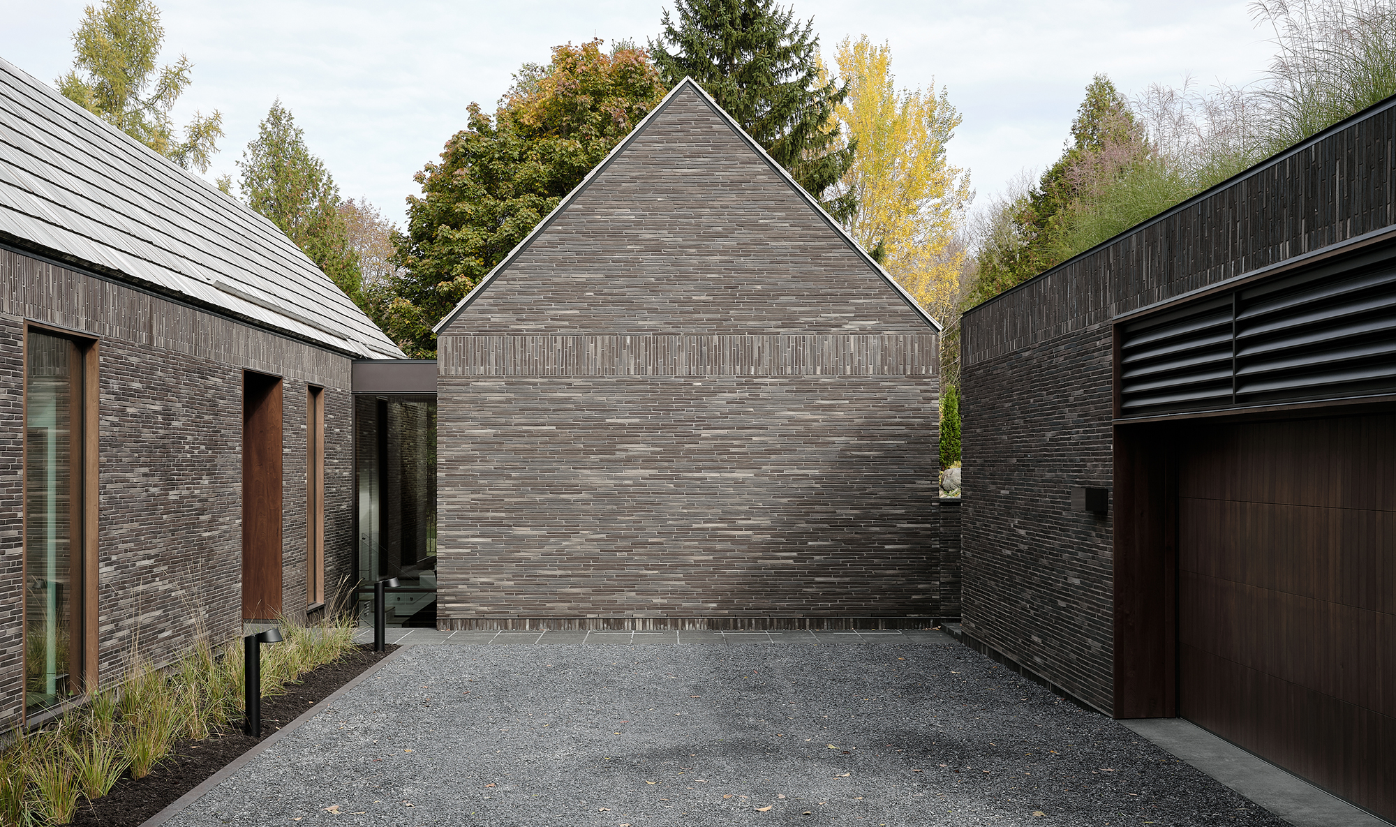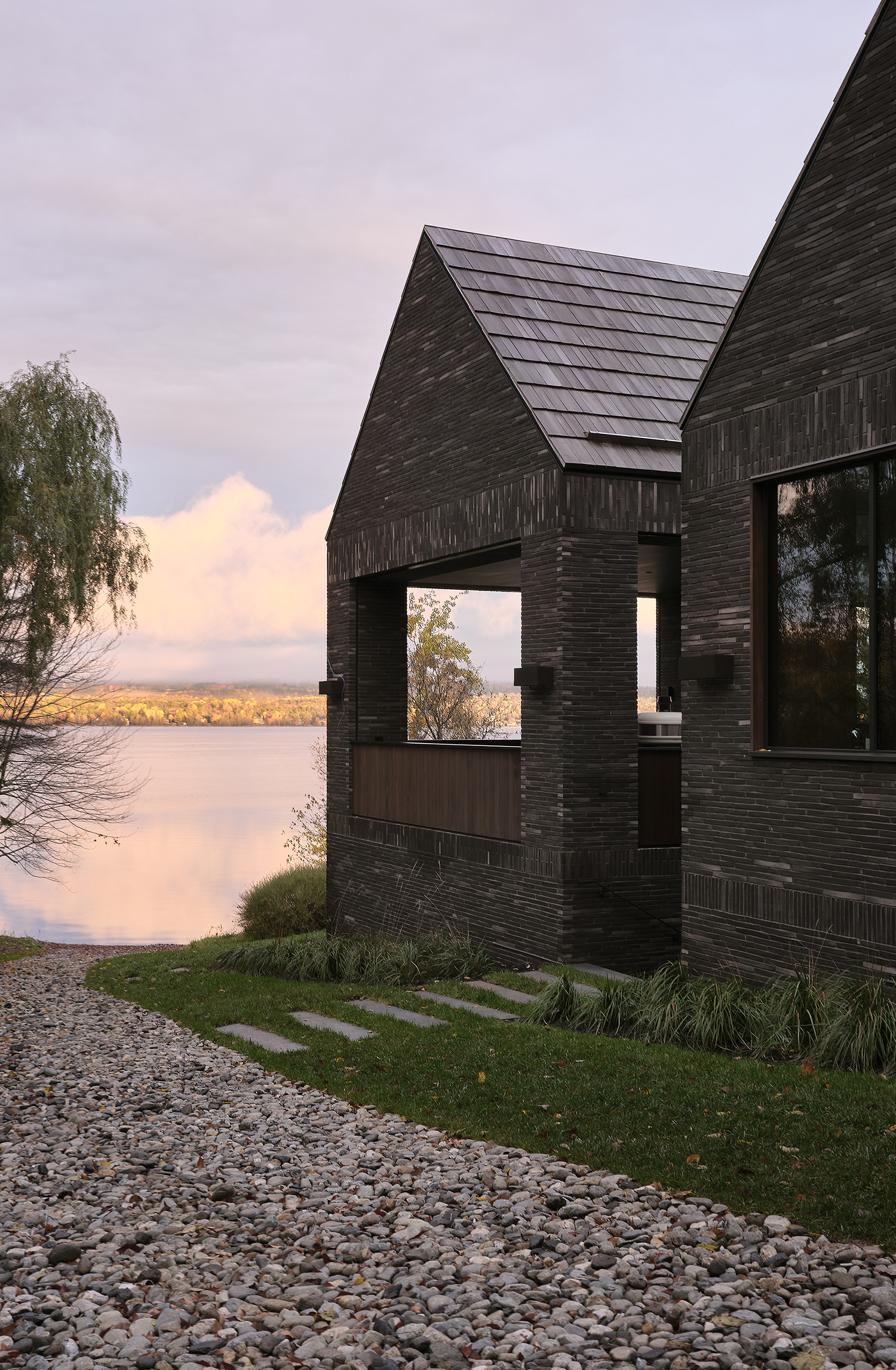 On the picturesque west side of Lake Memphremagog in Magog, Canada, the Lakeside Gallery Residence rises as a modern reinterpretation of traditional barn architecture characteristic of rural Quebec. The design is manifested in four distinct building forms: a summer house, a covered winter house, a living area, and a guest quarter. Cedar wood roofs, brick walls, and glass bridges unite the structures into a harmonious overall experience.