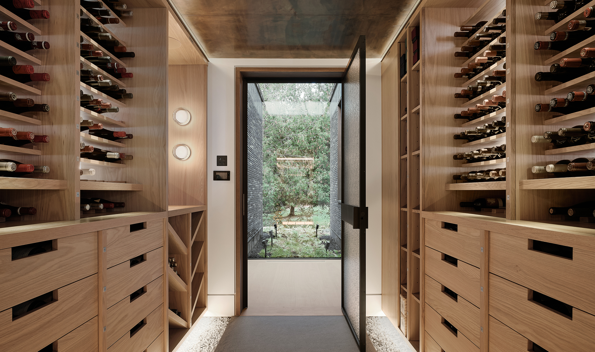 The wine cellar holds over 1,200 bottles, specifically designed to accommodate Burgundy bottles. A micro-ribbed glass and bronze door leads into a space clad in white oak, which seems to hover between a gravel floor and a bronze ceiling. Recessed lighting and bronze mirrors create a warm, inviting atmosphere in the interior.