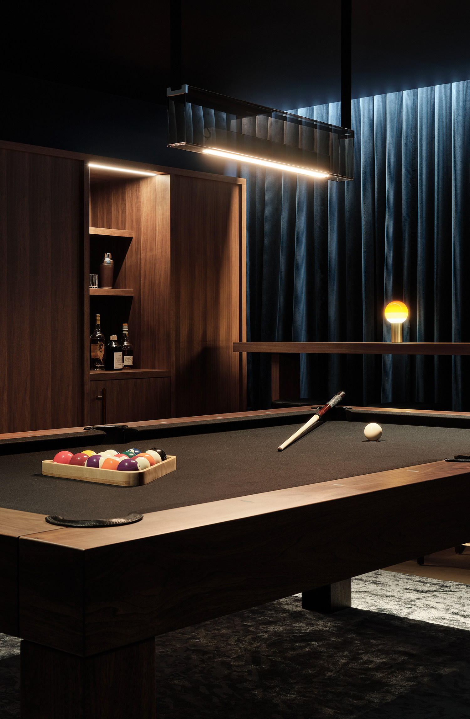 The billiard room features deep blue corduroy curtains and elegant walnut wood. The black felt of the billiard table is tastefully complemented by the overhead light fixtures, which are adorned with black nylon straps.