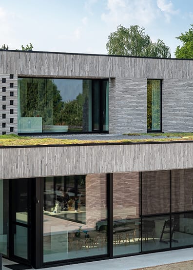 When laying bricks vertically, magic occurs. The bricks at Villa Peer are utilized in both a horizontal and vertical application, creating a striking contrast with the orientation of their color patterning. In a mix of evergreens and gray, huge panorama views make this Belgian villa one of a kind. Here Ultima RT 156 is acting an important part in the bricked gables and overhangs and thus creating a notable contrast in the overall expression of the house.