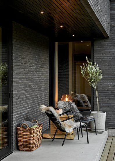The “vivid black” color of these bricks blends the building into its wooded surroundings while creating a sense of warmth at the entrance to the home.