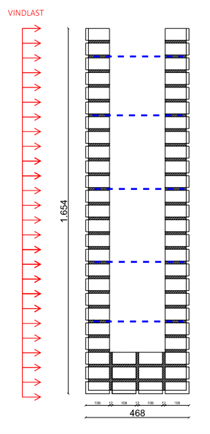 The beams have a height of 25 courses, which is equal to 1654mm, and a depth of 4 bricks. They span freely for both horizontal and vertical loads and are constructed as pre-stressed brick beams - WITHOUT a concrete core or embedded steel profile.