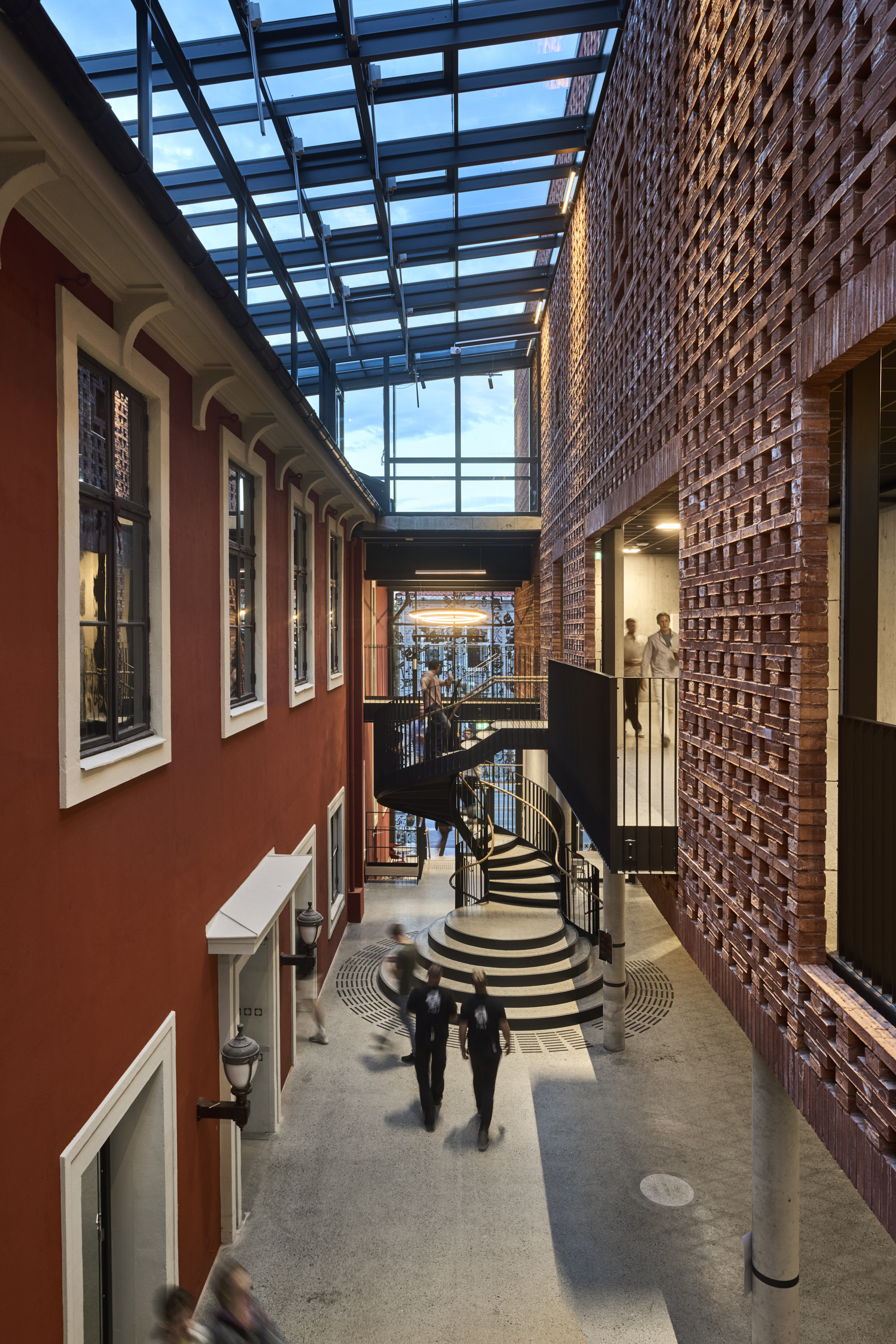 The bricks are plastered with ornaments around the windows and cornices. In the extension, the brick is exposed in a lattice brick screen, revealing its natural form and creating its own ornaments. The screen extends into the interior in the glass courtyard. The pattern in the screen facade features rosette designs found in the original facade, which is also Studentersamfundet’s logo.