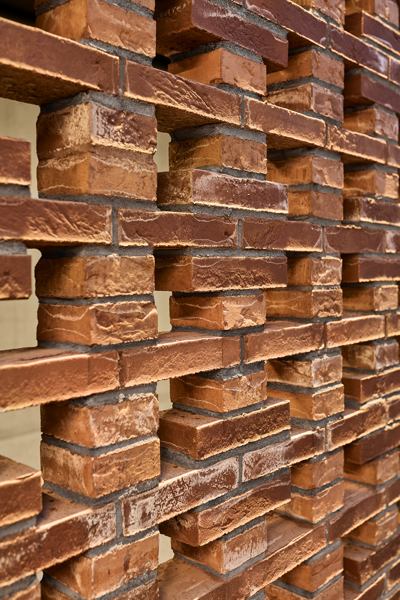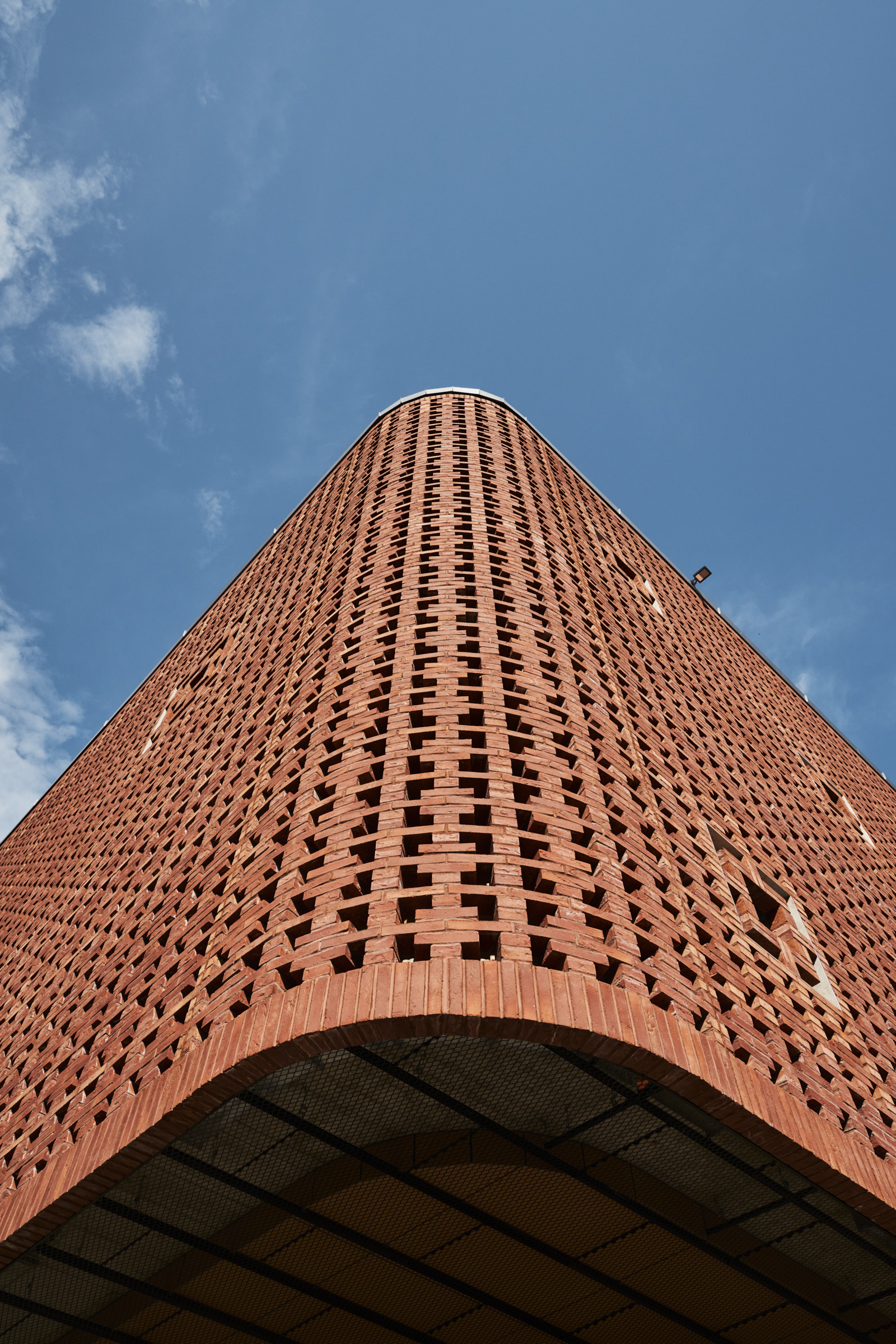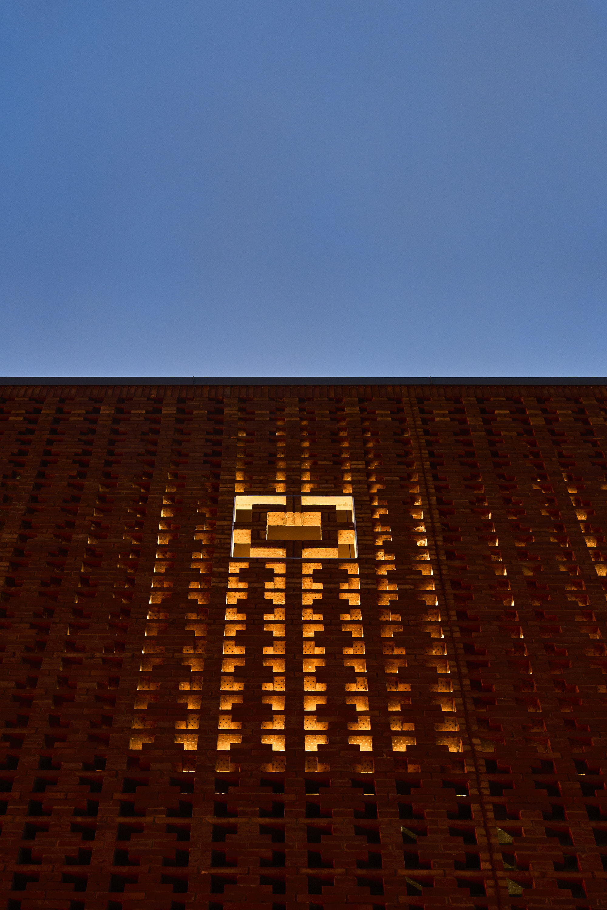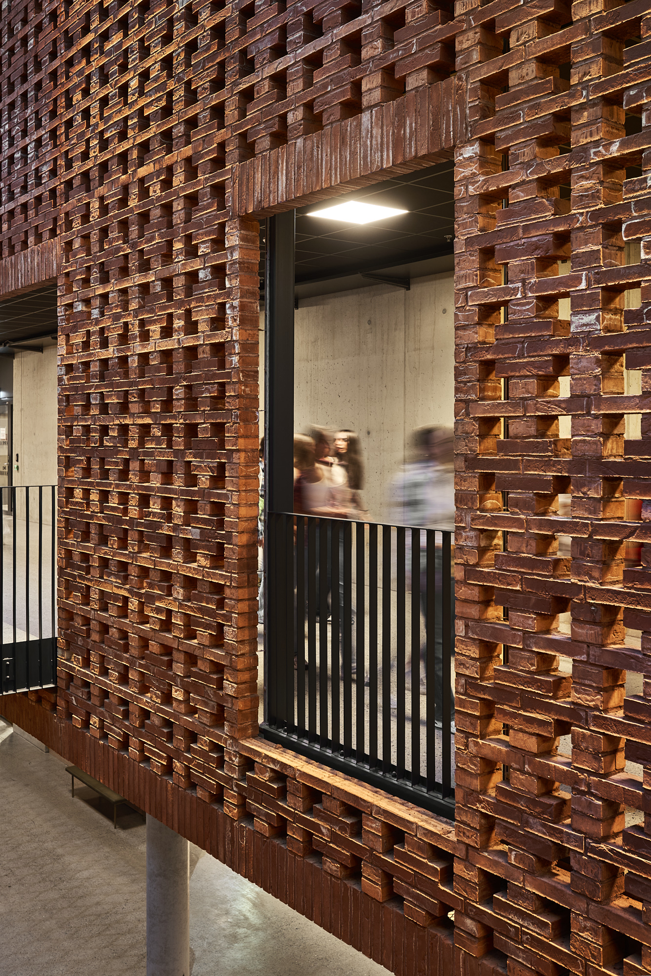 The screen is supported by steel columns behind it and is a combination of prefabricated brick beams and exposed brickwork. The thermal envelope with glass sections and windows is set back behind the screen so that light from the activities filters out and is broken up. The glass facades are decorated with prints of UKA culture festival posters.